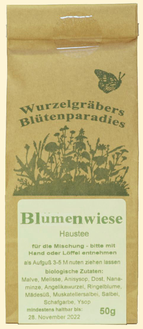 Blumenwiese Ist eine sehr ausgewogene, alte Klosterkräutermischung, die uns durch Ihre Lichtfülle mit Harmonie beglückt. Zutaten kbA: Malve, Zitronenmelisse, Ringelblume, Holunderblüte, Drachenkopf, Ysop, Johanniskrautblüten, Kamille, Kornblume, Muskatellersalbei |