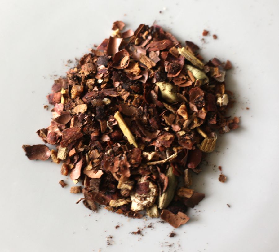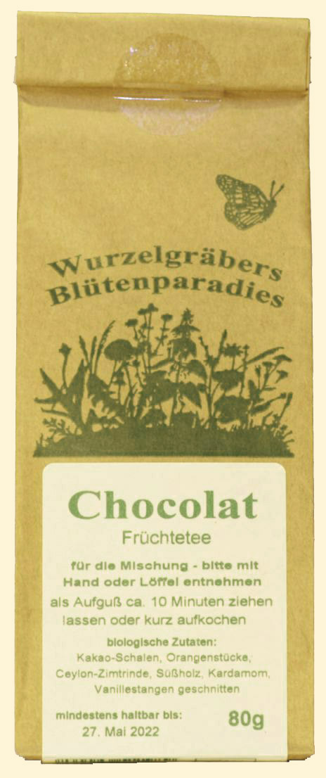 Chocolat .. könnte süchtig machen. Aber die aktuell hohen Vanillepreise machen ihn schon fast zu einem besonderem Luxusvergnügen. Dieser fruchtige Tee passt gut zu Kuchen oder man genießt Ihn einfach als besonderen Nachtisch. Zutaten kbA: Kakaoschalen, Orangenstücke, Zimtrinde Celyon, Süßholz, Kardamom grün, Vanillestangen |
