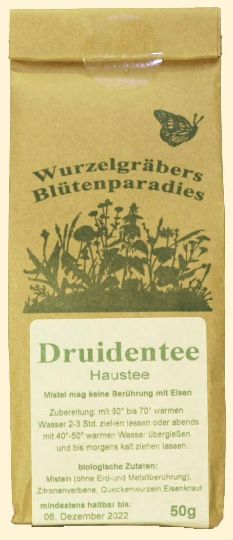 Druidentee Der Druidentee ist ein echter Vier-Elemente-Zaubertrank. Die Quecke durchwächst die Erde. Die Mistel gedeiht in der Luft zur Kugel. Die zitronige Verbene beperlt das Wasser. Im Eisenkraut begegnen wir der läuternden Kraft des Feuers. Und mit jeder Tasse Druidentee haben wir tugendhafte, leise Wünsche frei. Zutaten kbA: Mistel (41%), Zitronenverbene, Queckenwurzel*, Eisenkraut* *Kräuter aus Wildsammlung |