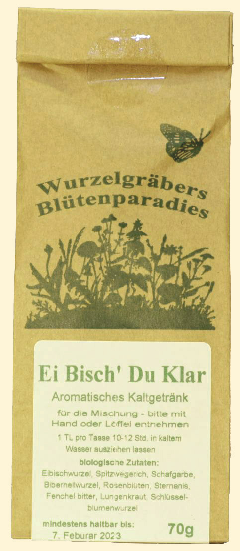 Ei Bisch' Du Klar Die stärkehaltige Eibischwurzel ist in unseren Breiten seit alters her ein treuer, heute fast vergessener Begleiter durch die kalte Jahreszeit, wenn sich die stets alles erneuernde Grünkraft unter die Erde zurückgezogen hat. Der auf Brachland weit verbreitete und am trockenen Kraut leicht erkennbare rohe Wurz war in der mageren Jahreszeit ein beliebter nährender Kraftsnack für Wanderer und arme Leute. Diese Wurzel will von uns ausgegraben werden, denn dabei bereiten wir ihr Saatbeet für die nächste Saison. Unterstützt vom lieblichen Fenchel und Sternanis durchdringt er uns hier mit seiner unwiderstehlich klärenden Sanftheit. Unsere besondere Zubereitungsempfehlung: ca. 1 TL pro Tasse (abends) in kaltem Wasser ansetzen und 8-12 Stunden ziehen lassen und nicht erhitzen, maximal leicht anwärmen. Zutaten kbA: Eibischwurzel, Spitzwegerich, Schafgarbe, Bibernellwurzel, Rosenblüten, Sternanis, Fenchel bitter, Lungenkraut, Schlüsselblumenwurzel |