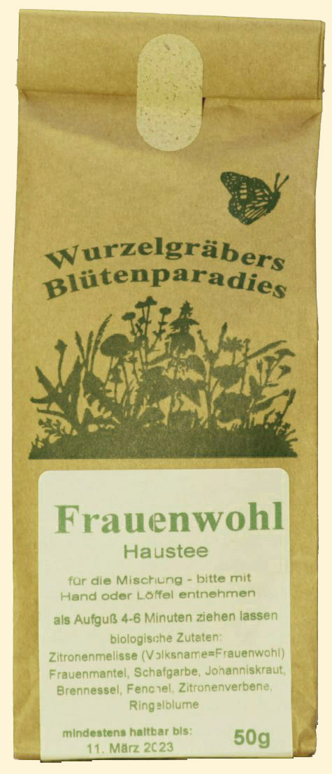 Frauenwohl Hierin entfalten Frauenschutzkräuter mit alter Geschichte Ihre Magie. Vielen Frauen hilft schon eine Tasse Tee von diesem wohlschmeckenden Kräutertee sich in schwankenden Stimmungslagen einfach zu erheitern. Ein Seefahrer würde sagen: "Mit einer Tasse Frauenwohl haben Sie immer eine Handbreit Wasser unterm Kiel." Auch mancher Mann findet ihn so lecker, dass er sich durch den Namen Frauenwohl diskriminiert fühlt! Zutaten kbA: Zitronenmelisse, Frauenmantel*, Schafgarbe*, Johanniskraut*, Brennesselblätter*, Fenchel bitter, Zitronenverbene, Ringelblume * Kräuter aus Wildsammlung |