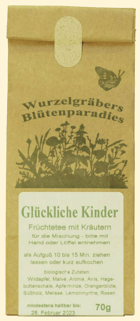 Glückliche Kinder Besondere Kräuter umschmeicheln wild gesammelte Früchte. Es ist ein Kinderspiel sich von allen Fesseln zu befreien. Zutaten kbA: Wildapfel, Malve, Aronia, Anis, Hagebuttenschale, Apfelminze, Orangenblüte, Süßholz, Melisse, Lemonmyrthe, Rosen |