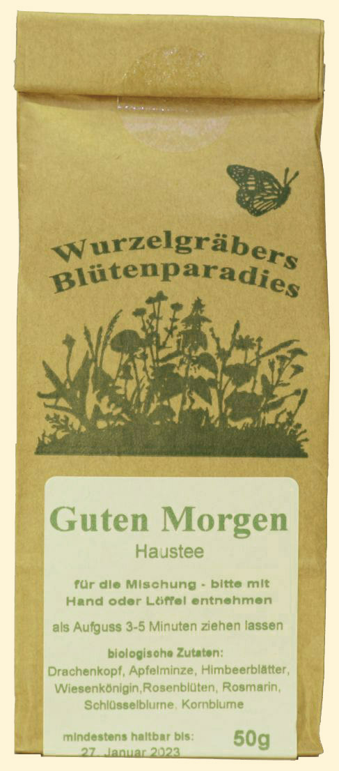 Guten Morgen Eine Tasse von diesem Kräutertee gibt mir mehr und lang anhaltendere Kraft für den neuen Tag, als drei Tassen Kaffee. Denn echte Stärke möchte nicht gepuscht werden, sondern sich aus einem inneren Gleichgewicht entfalten. Zutaten kbA: Drachenkopf, Apfelminze, Himbeerblätter, Wiesenkönigin (Mädesüß), Rosenblüten, Rosmarin, Schlüsselblume, Kornblume |