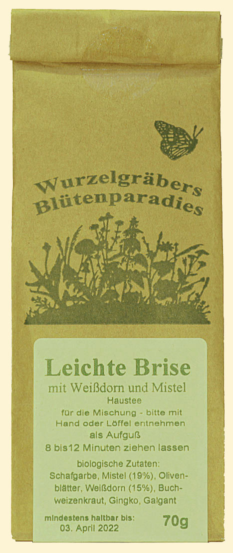 Leichte Brise Der Geschmack dieser Kräuterteemischung mit mythischer Mistel und urzeitlichen Gingkoblatt erinnert an einen sehr guten Grüntee und ist ideal, um immer wieder unnötigen Druck abzulassen. Zutaten kbA: Schafgarbe, Mistel (19%), Olivenblätter, Weißdorn (15%), Buchweizen, Gingko, Galgant |