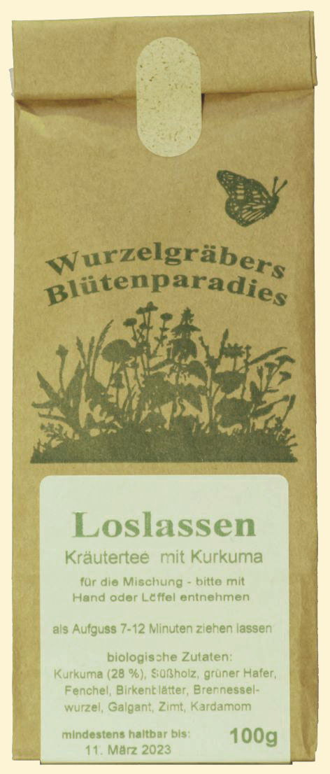 Loslassen Ganz besondere Zutaten runden den kräftigen Curcuma zum wunderbaren Aroma. Nach einer Tasse Loslassen fällt es uns leicht alles Unnötige und Überflüssige fallen zu lassen. Zutaten kbA: Kurkuma (28%), Süßholz, grüner Hafer, Fenchel, Birkenblätter, Brennesselwurzel, Galgant, Zimt, Kardamom |