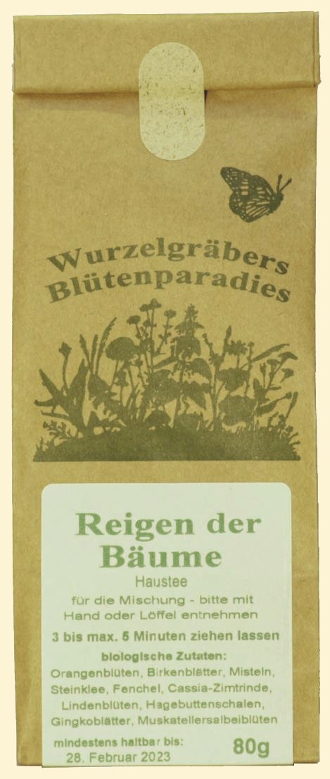 Reigen der Bäume Bei der Geburt von diesem geschmacklichem Wunder war der Kopf nicht beteiligt, weil Gedanken manchmal hinderlich sind. Er huldigt den unzähligen kleinen Helfern mit ihrer riesigen Leistung und ermöglicht Sauerstoff bis in die hintersten Winkel unseres Gehirns zu befördern. In diesem, sehr anspruchsvollem Tee vereinen sich die einzeln geschmacklich fraglichen Misteln, Birkenblatt und Ginkgoblätter zu einem anmutigem Walzer. Zutaten kbA: Orangenblüten, Birkenblätter, Misteln, Steinklee, Fenchel bitter, Zimtrinde, Lindenblüten, Hagebuttenschalen, Ginkgoblätter, Muskatellersalbei |