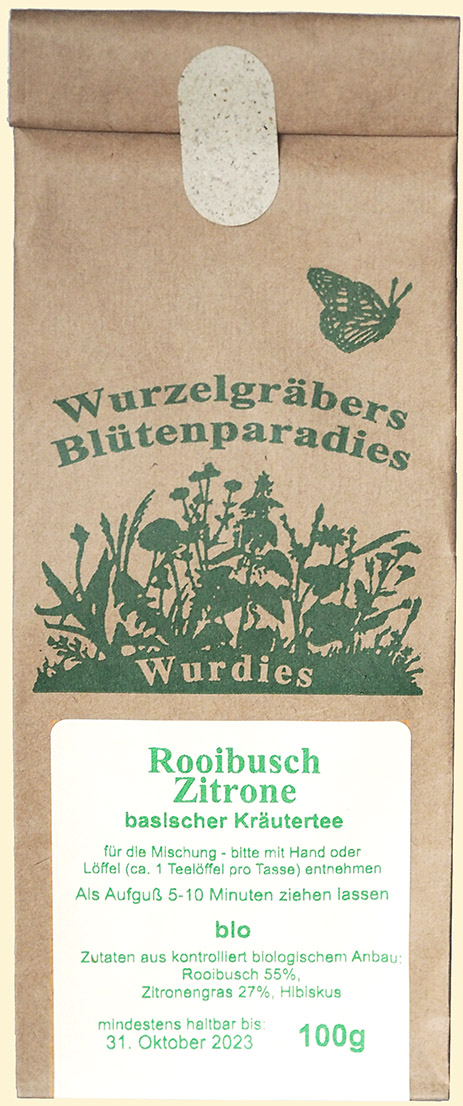 Zutaten kbA: Rooibusch (55%), Hibiskus, Zitronengras