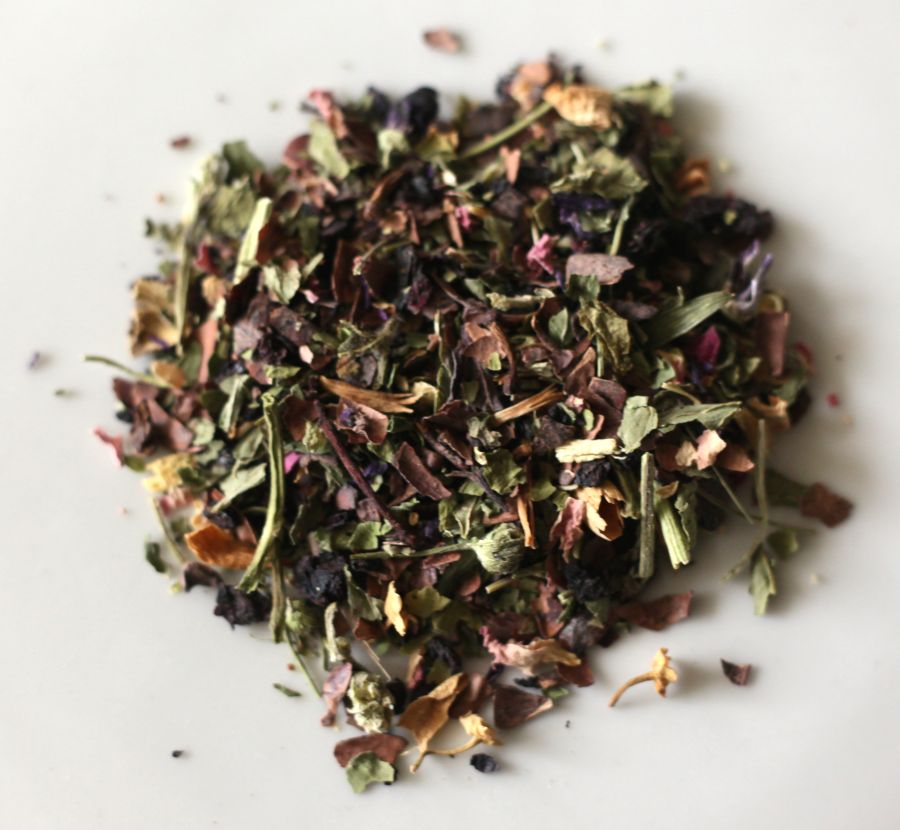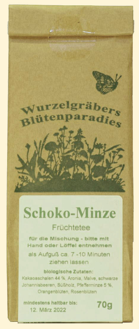 Schoko Minze Ein Hauch von Kakao und ein Hauch von Pfefferminze ist mit Cassis- und Pomeranzenblüten gewürzt. Zutaten kbA: Kakaoschalen (44%), Malve Blatt und Blüte, Aroniabeeren, schwarze Johannisbeeren, Orangenblüten bitter, Pfefferminze (5%), Süßholz, Rosenblütenblätter |