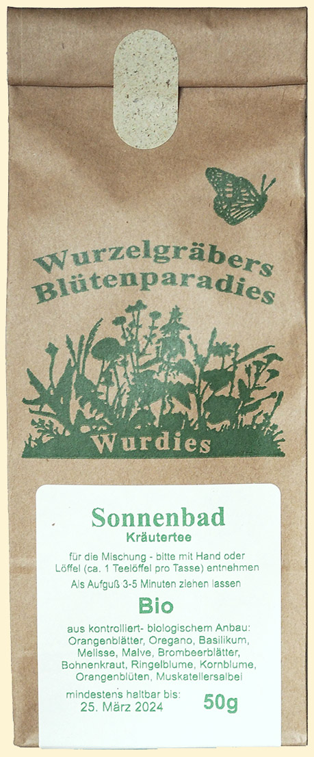 Sonnenbad Vom Sonnenbad Sattes Grün und volle Würze deinem Heil von Gott gesandt füllen Herz und alle Räume verdrängen dabei dunkles Leid. Mache Regen, Wind und Wärme erhelle Seele dir und bin schlicht Licht. Zutaten kbA: Orangeblätter, Oregano, Basilikum, Melisse, Malve Blatt und Blüte, Brombeerblätter, Muskatellersalbei, Bohnenkraut, Ringelblume, Kornblume, Orangenblüte) |
