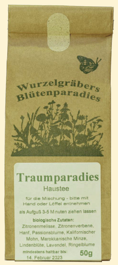 Traumparadies ist das gewisse Etwas woraus gute Träume gemacht sind. Nicht alleine der Hanf, aber eine bunte traumhafte Mischung gibt dem Tee den Geschmack, der uns einfach nur noch träumen lässt. Zutaten kbA: Zitronenmelisse, Zitronenverbenen, Hanf, Passionsblume, kalifornischer Mohn, milde Minze, Lindenblüten, Lavendel, Ringelblume |